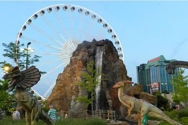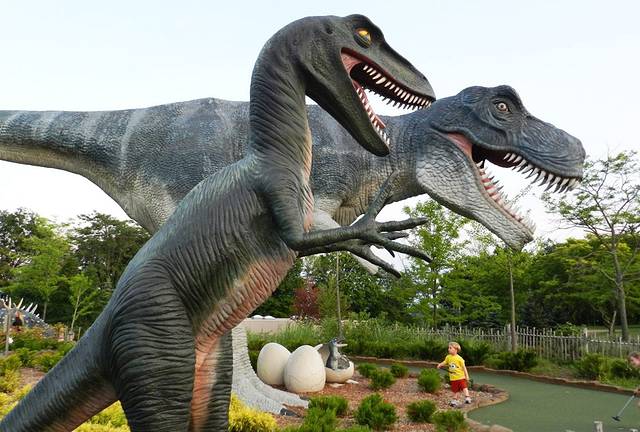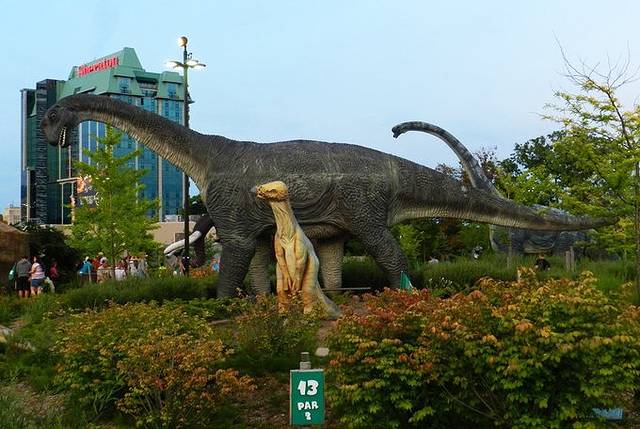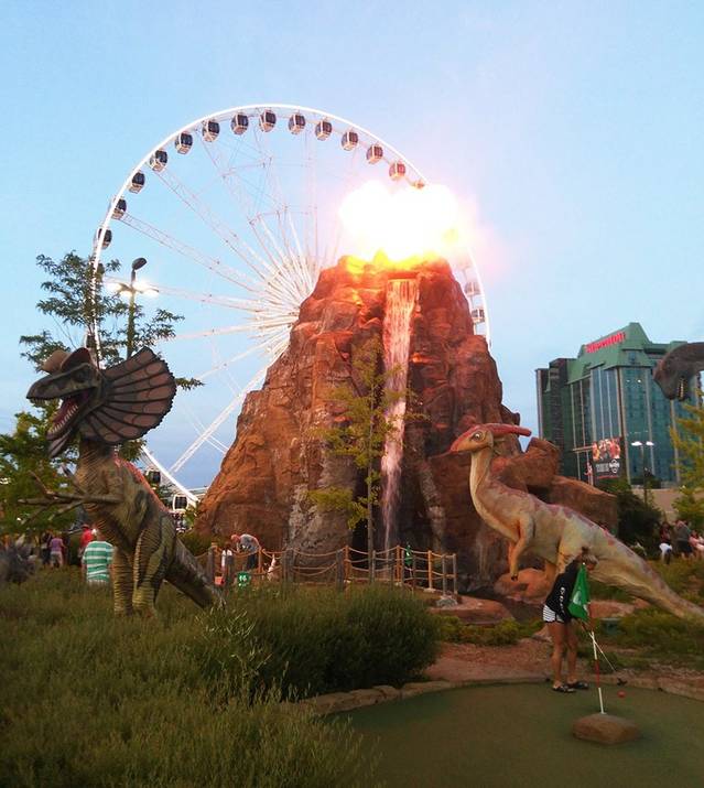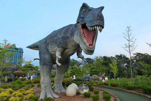 这是模拟的火山,四五分钟就会喷火一次。喷发的时候隆隆作响,旁边的恐龙还会发出音效配合。