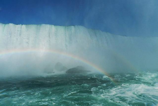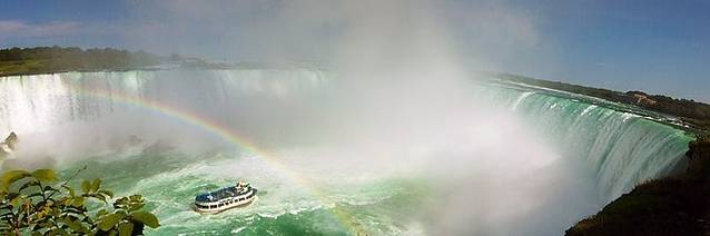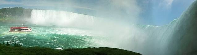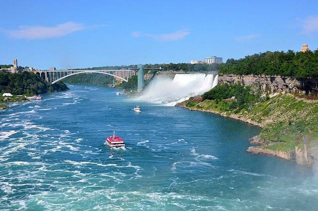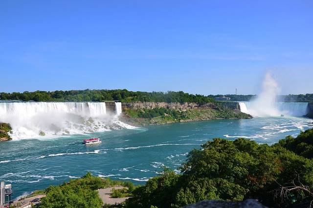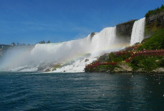 红色的“Hornblower”游轮完成了冲击大瀑布的壮举,向下游的码头返航,它的前方就是连接美加两国的“彩虹桥Rainbow Bridge”,右侧则是“美国瀑布”和“新娘面纱瀑布”。