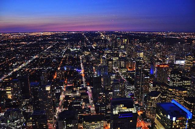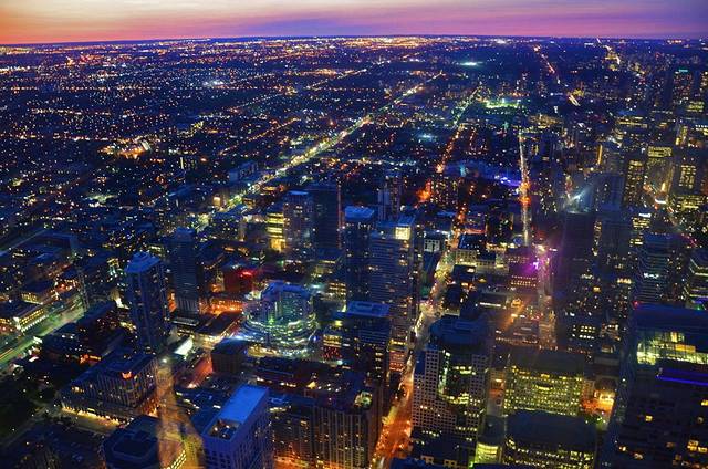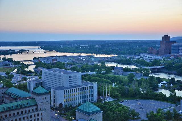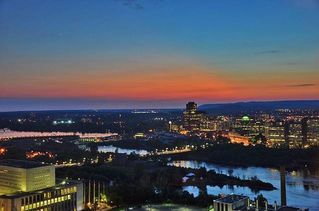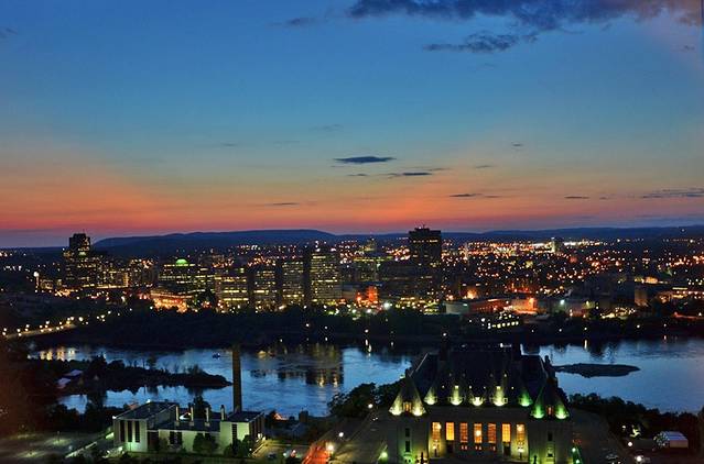 太阳落山之后又拍的几张照片,其中这张是西向视角,正中央四四方方的建筑物就是刚才路过的国家图书和档案馆。最近的一座桥就是我们才走的朋托波提桥Portage Bridge。