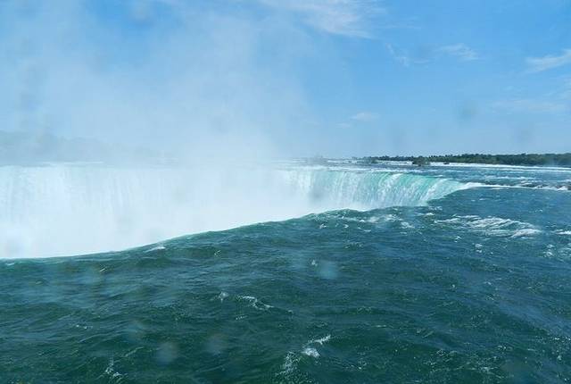 游轮继续顽强地迎着大浪向瀑布挺进,最近时甚至离水墙只有几十米的距离,游船和满船的游客都被巨大的水雾牢牢地罩住,滂沱大雨劈头盖脸地砸来,此时再好的雨衣也无法抵御大瀑布的盛情。每个人都努力地睁大眼睛,透过雨帘欣赏从天而降的瀑布(此时再想照相那真是奢谈了),伴着震耳欲聋的水声,感觉自己似乎就要被这个巨大的怪物吞没了。这与其说是在观赏瀑布,还不如说是在亲身体验瀑布。
