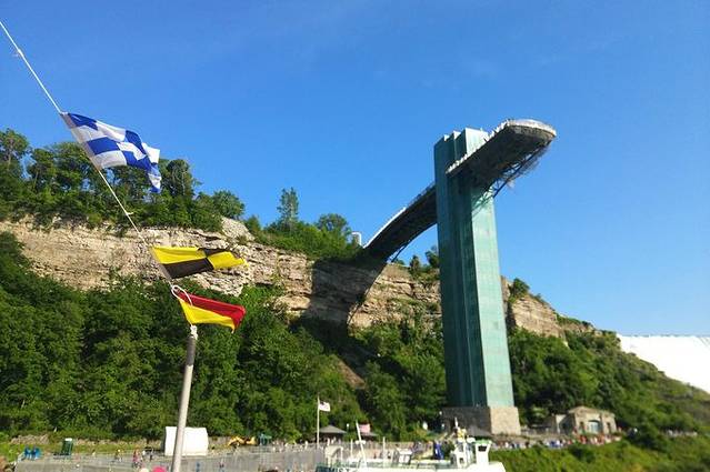 由于在美国境内只能看到尼亚加拉大瀑布的侧面(包括马蹄瀑布和瀑布瀑布),而无法象在加拿大一样一览全貌,于是心有不甘的美国人修建了这样一座象蹦极跳样的平台,让大家可以不必进入加拿大境内多看到点瀑布。