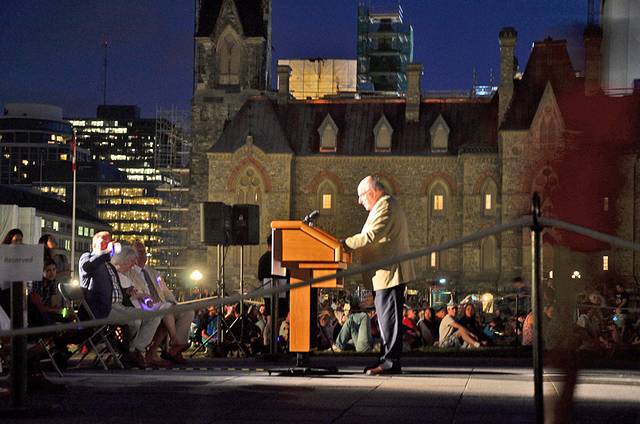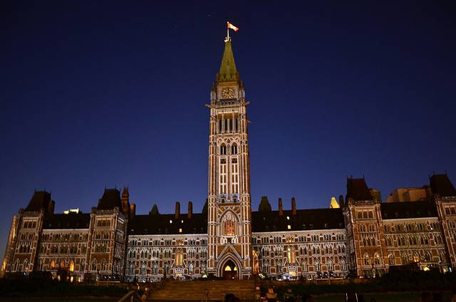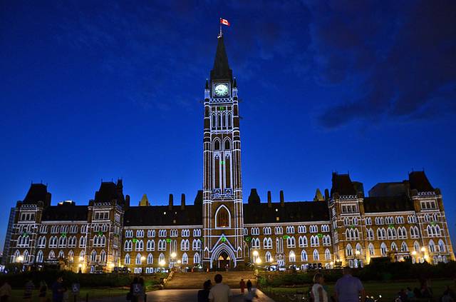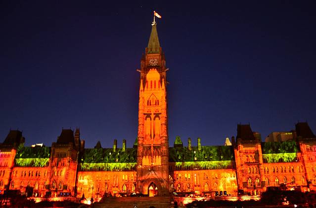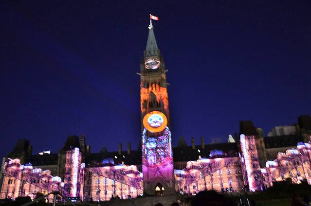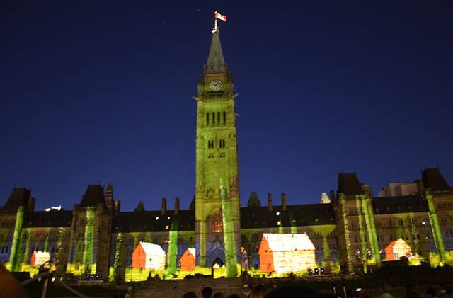 然后我们回房间休息了一小会儿,再出门去看“国会山灯光秀Light Show”。这是渥太华夏季每晚都有的重要表演项目,每场持续大约30分钟,把整个加拿大的历史和自然展现的淋漓尽致,堪称一场如梦如幻的视觉盛宴,非常值得一看。不过今天是本年度第一场,也就是说如果是安排7月9号或者之前住到渥太华,晚上就看不到这个表演了,所以请注意各种信息,提前规划好行程(2015年是7月10日至9月12日)。