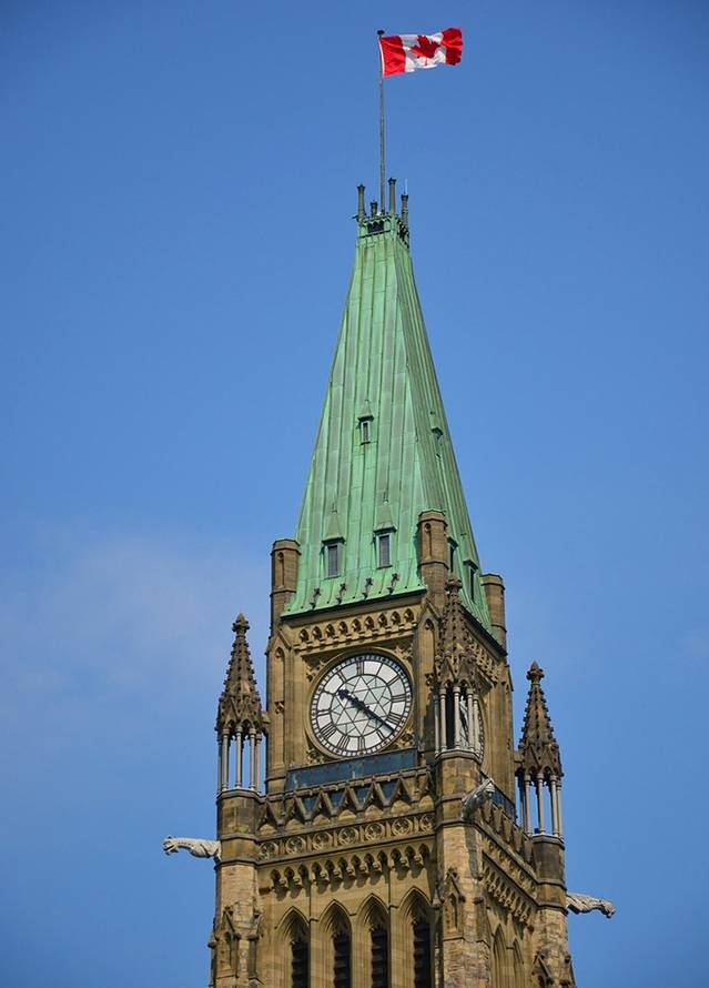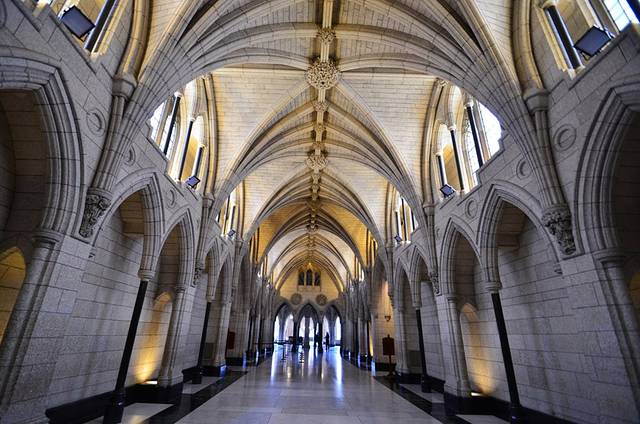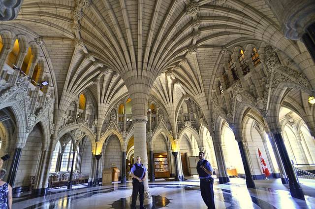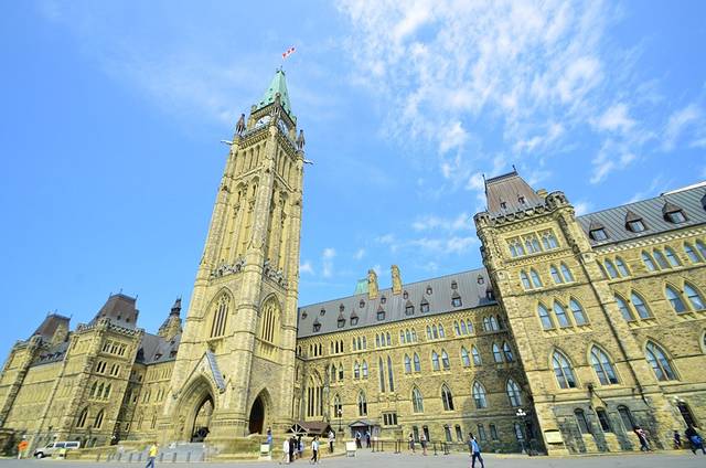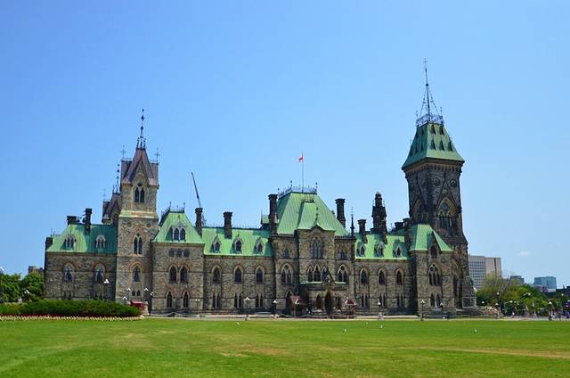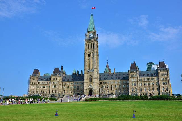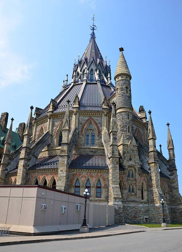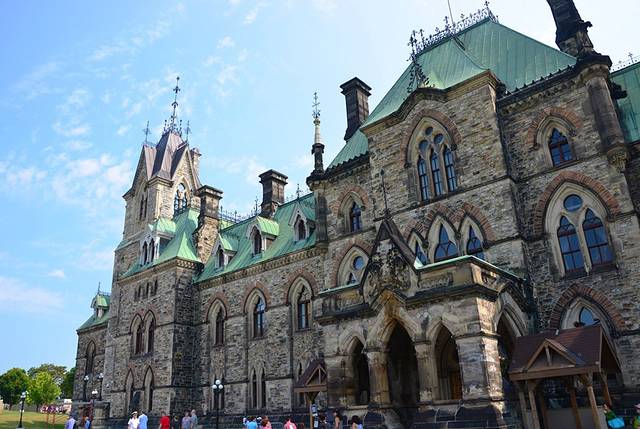 加拿大国会大厦由三栋哥特式尖顶建筑组成,分为中央区域、东翼与西翼,是加拿大政府及参众两院的所在地。国会大厦于1859年开始动工,到1866年正式建成,由当时著名的建筑师Thomas Fuller及Chilion Jones联手设计,整座建筑用料严谨考究、装修精美独特。