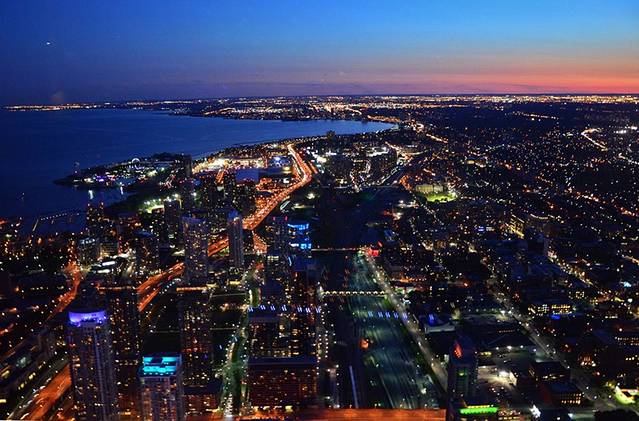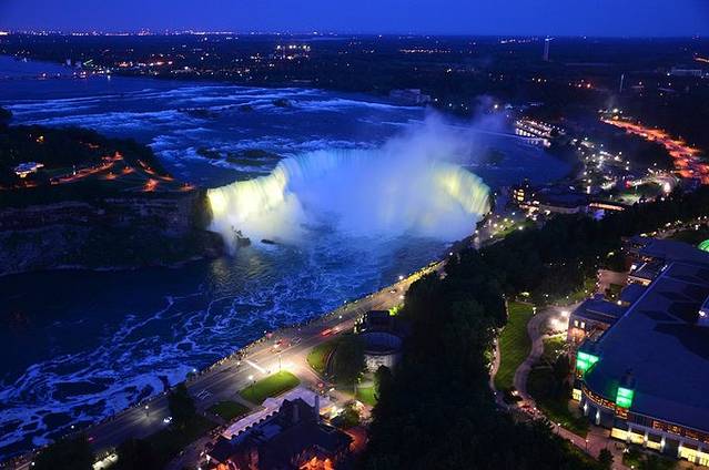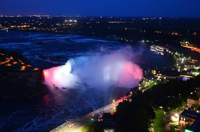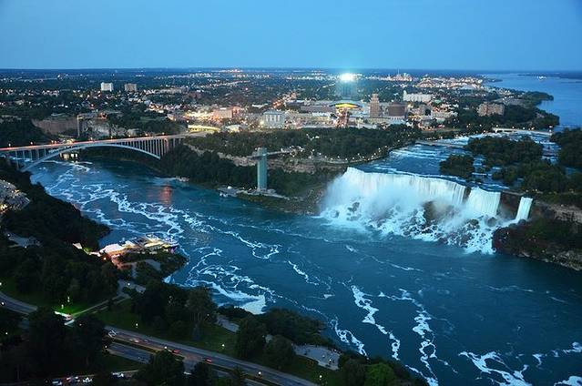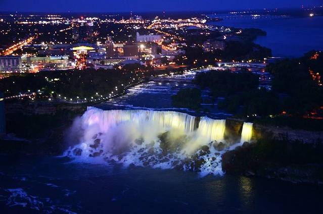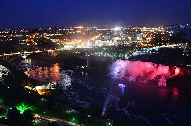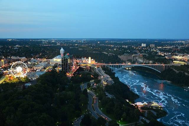乘坐观光电梯登上斯奇隆塔顶时,夜幕开始降临。尼亚加拉河两侧的城市里灯光都已点亮。