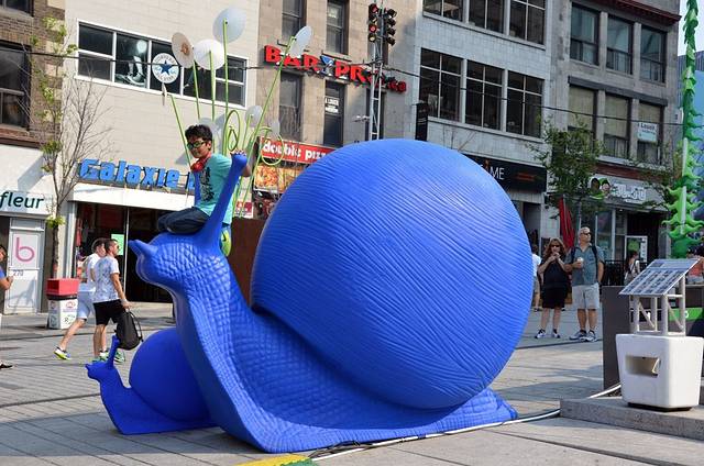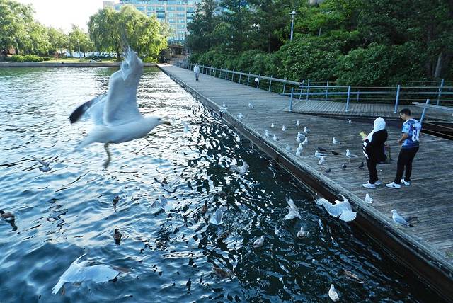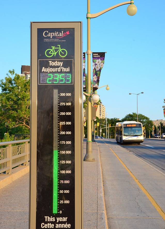 然后我们在桥上发现了这个,应该是个带摄像的计数器,记录着每天有多少辆自行车通过大桥,当天已经有2353辆自行车驶过(我们还特地在牌子前面来回跑了两下试试,计数器都无动于衷,但一有自行车驶过时马上就跳数)。下面的绿色杠杠则是全年自行车的累计通过量。看来绿色出行在加拿大的首都是深入人心滴。