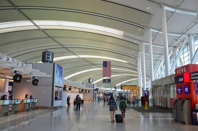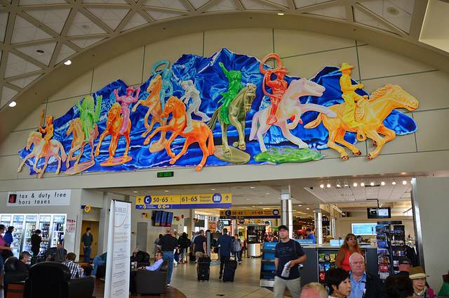好了,还完车算完账,走进卡尔加里机场航站楼。这是办票大厅,比较困惑的是挂着两面美国旗却只有一面加拿大旗。