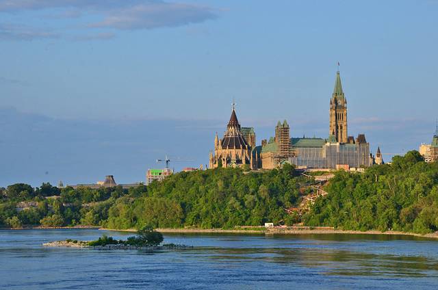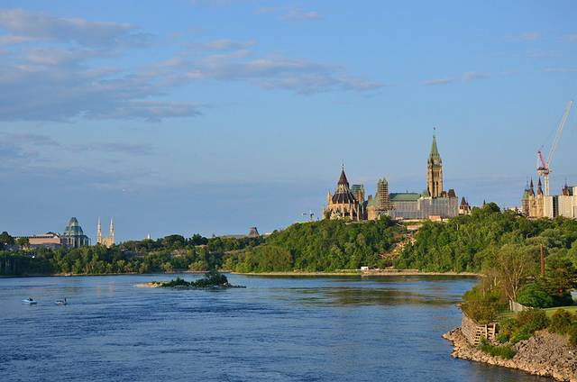 渥太华河,远处的两个银色的尖顶是渥太华圣母大教堂,右边近处的建筑物则是国会大厦。