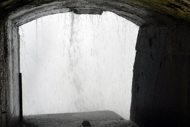 这里又会给大家发放一件新的黄色的一次性雨衣,然后搭乘电梯下降到38米深的地下,进入1889年在此处挖掘的,全长46米的西尼克隧道。这座潮湿狭窄的隧道有几个分支,我们先来到最远处的洞口,这里位于大瀑布的内侧,通过洞口可以看到外面飞泄而下的湍急流水。当然洞口很小,游客也不能很接近洞口,于是就没有太大的兴致:)。之后又走了另一个分支,也是差不多的洞口。