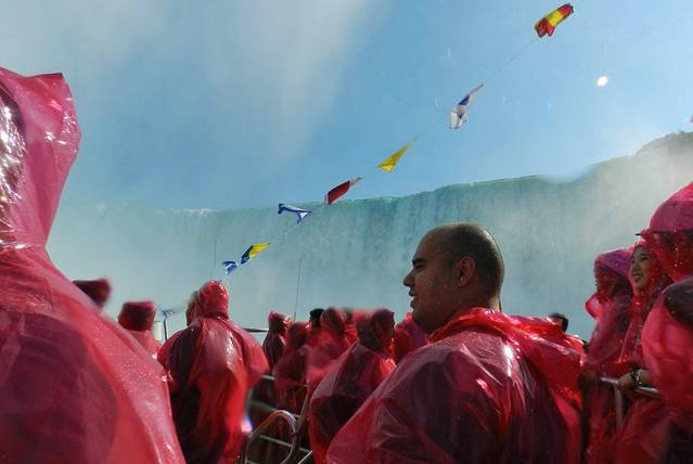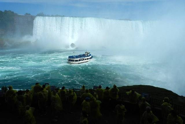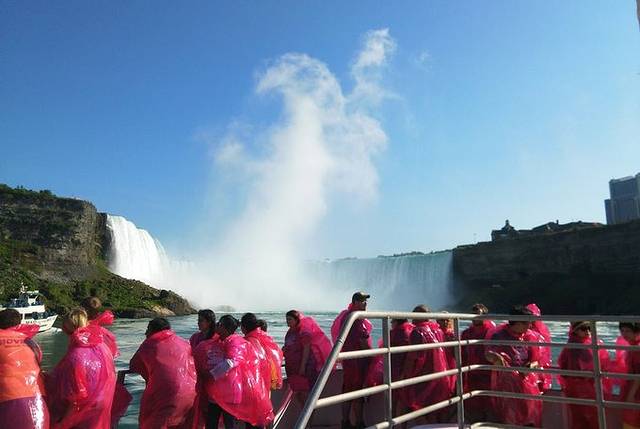 看得多了,才发现原来这里的游船有两种,轮番载着游客向大瀑布发起冲击。其中只有蓝色的(其实是船上游客身着蓝色的雨衣)才叫“Maid of the Mist”,而红色的(船上游客身着红色雨衣)则叫做“Hornblower”。后来我们知道“Maid of the Mist”是美国方面的游轮,而“Hornblower”,也就是我们一会儿乘坐的,才是加拿大的游轮。