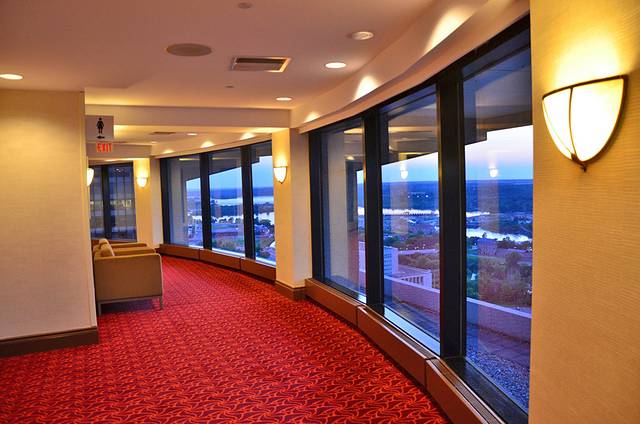 回到酒店,我们直接乘电梯来到顶层的圆形观光厅。这座观光厅并非全周的,只有面对渥太华河的半圈才有弧形落地玻璃。