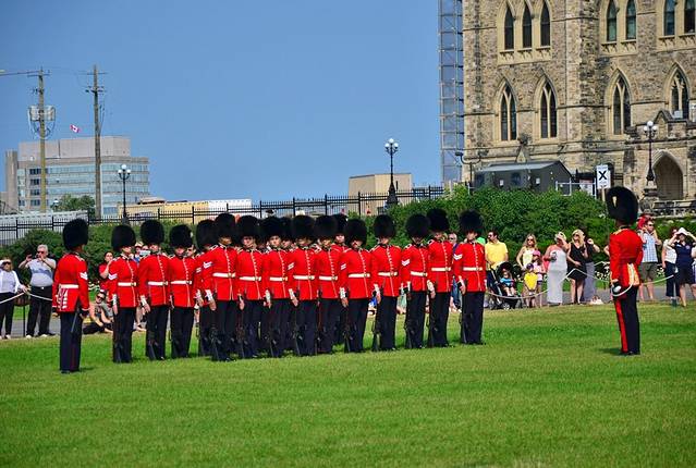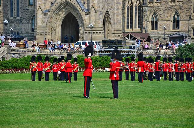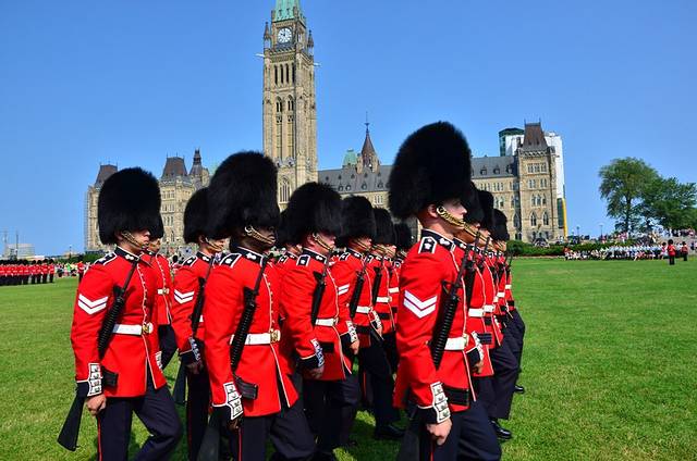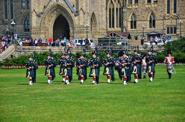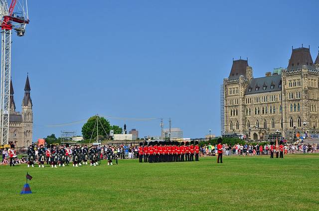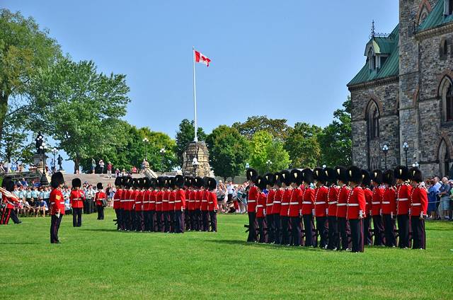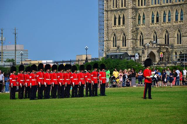 十点整,我们回到国会山广场,国会大厦前草坪的西侧,皇家卫队已经集结完毕。这是传统的大英帝国皇家仪式,卫队的穿着也都是英式制服。左边列队的则是军乐队,深绿色服装,花格子裙,看起来很像苏格兰装束。
