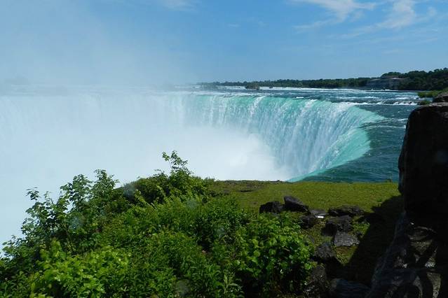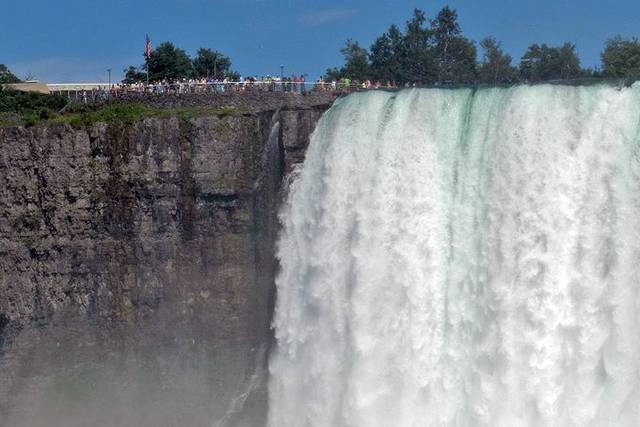 欣赏花钟之后,我们乘坐南向大巴耗时半个小时,1点多钟抵达了大瀑布的核心区岩石瞭望台Table Rock。这个面向大瀑布,像圆桌一样突出来的岩石平台,拥有近距离观赏大瀑布的最佳视角。这里还有该地区最大的游客中心,内有多家餐厅和纪念品商店,“瀑布后面的旅程”、“尼亚加拉的震怒”等活动也都是在这里进行的。
