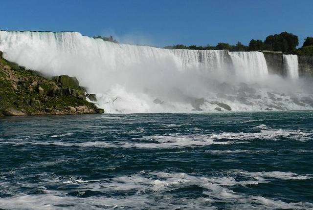 然后慢慢驶近美国瀑布,但因为河底有礁石,只能停靠在稍远处观赏。不过瀑布下白浪翻滚,即使远观也很壮观了。