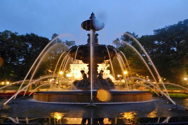 十点钟灯光秀表的演正式开始,刷地一下,整个广场的灯光全熄灭了,我的心也刷地一下凉了半截。还是刚才那副场景,前面拍的那张曝光时间是1/4秒,现在则足足要1.6秒。亲,下面这张照片是我手端着相机,曝光1.6秒拍出来的照片!真是要了个亲命啊,早知道我刚才宁肯跑一趟回去取三脚架了。