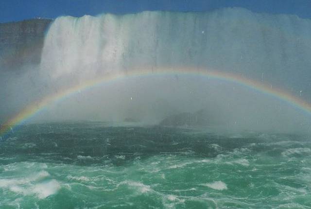 游轮从北侧缓缓接近大瀑布,此刻的船身已经被汹涌的水浪推得来回大幅度地摆动,冲天的水雾中一道完整的彩虹挂在奔腾的水墙上。