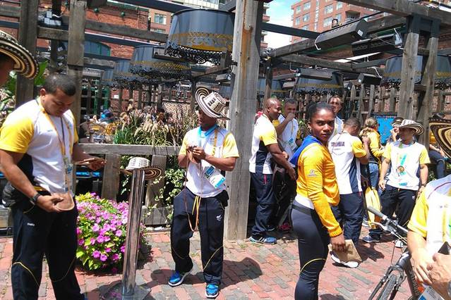 这是长焦镜头拍摄的马蹄瀑布美国一侧的凭栏观赏的游客,中间簇拥着的是美国的星条旗。