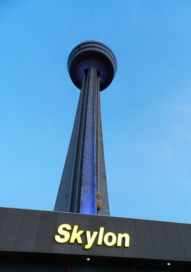 从摩天轮那里到斯奇隆塔也就五六百米远,不过我们前面耽搁的时间有点久,走到塔底的时候已经九点钟了,错过了当天的日落时间。斯奇隆塔Skylon Tower是尼亚加拉大瀑布周边,美加两国建设的四座观光塔之一,它总高达158米,在塔顶观光台可以俯瞰整个大瀑布和尼亚加拉瀑布城(如果不想花昂贵的费用乘坐直升机的话,这绝对是个省钱的替代方案)。