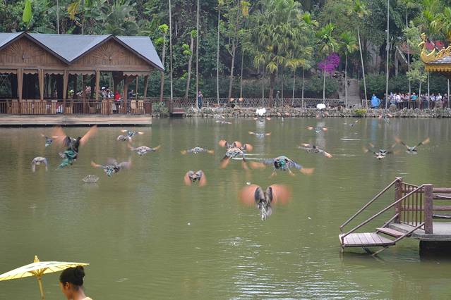 原始森林这个第一站就是看孔雀飞!伴随着音乐响起,湖对面就飞出一群的孔雀过来吃食,看到孔雀飞也是蛮不错的。满地的孔雀运气再差也会看到开屏的孔雀。