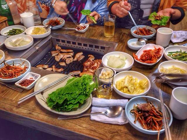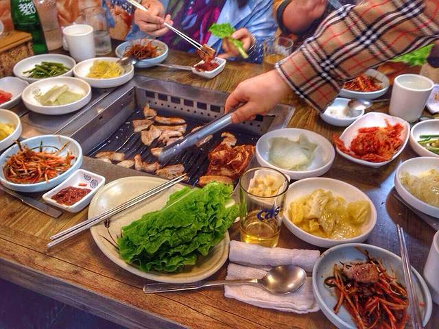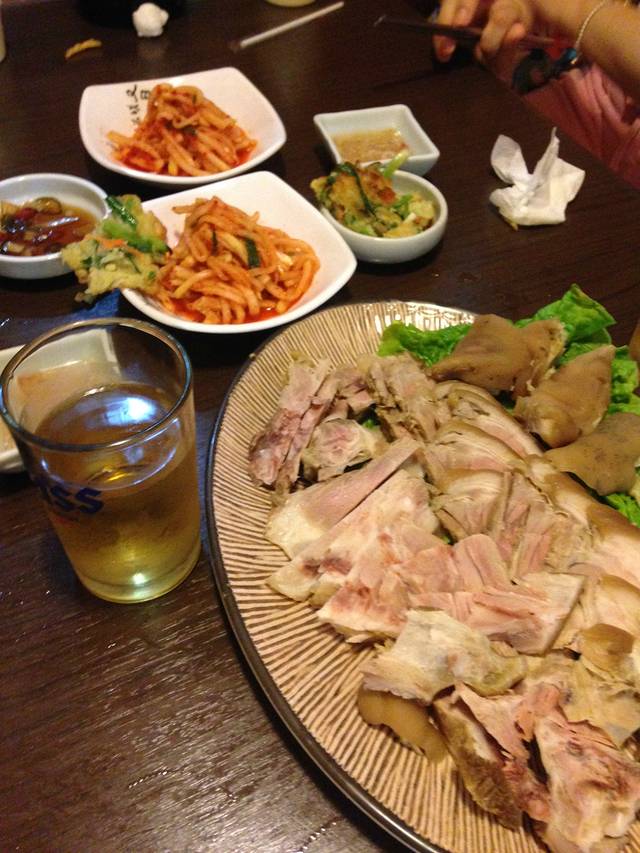 玩了一天,几个吃货又开始寻觅美食了,晚饭在小街弄堂里面找了家烤黑猪肉店,老板服务很周到,知道我们从中国来,就亲自给我们烤肉,很热情!在我们面前,还用剪刀剪成小块的肉,瞬间有种韩国人的感觉,很有意思,味道一样也超赞的!就是韩国的烤肉实在是太贵了,这里一盘烤肉的钱在宁波可以吃到扶着墙出来了,嘿嘿