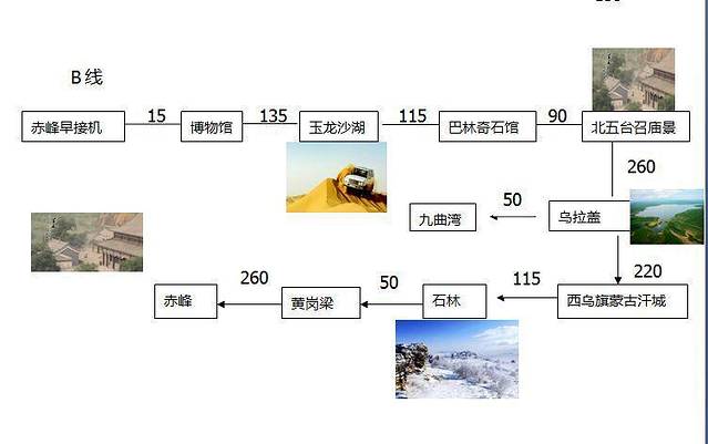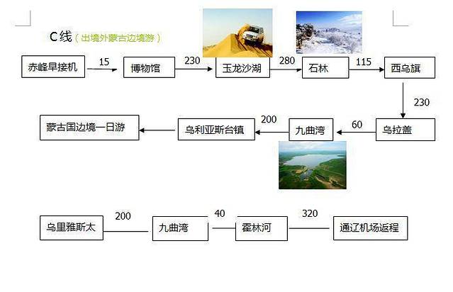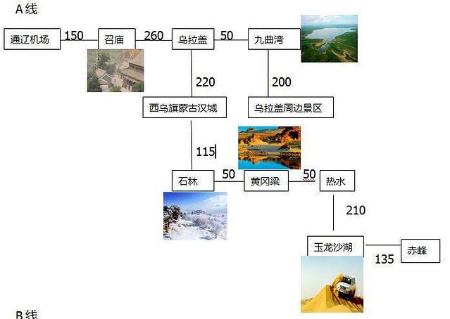 路线以赤峰、通辽为始,标明公里数,以及个别景点风景展示!