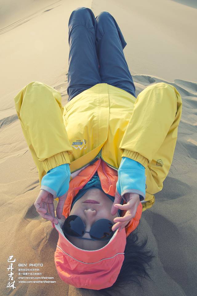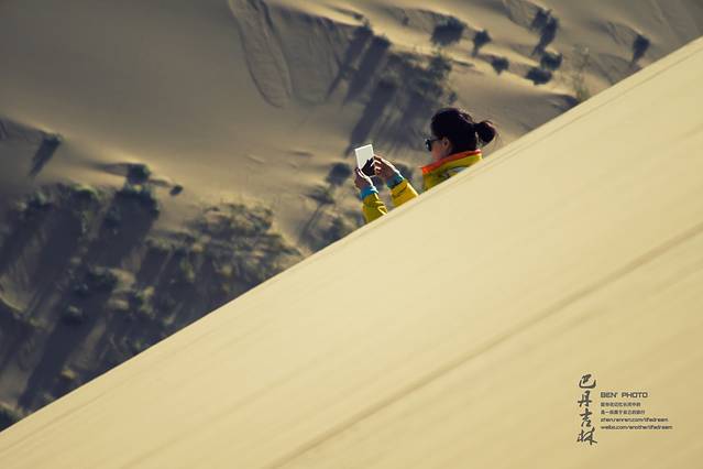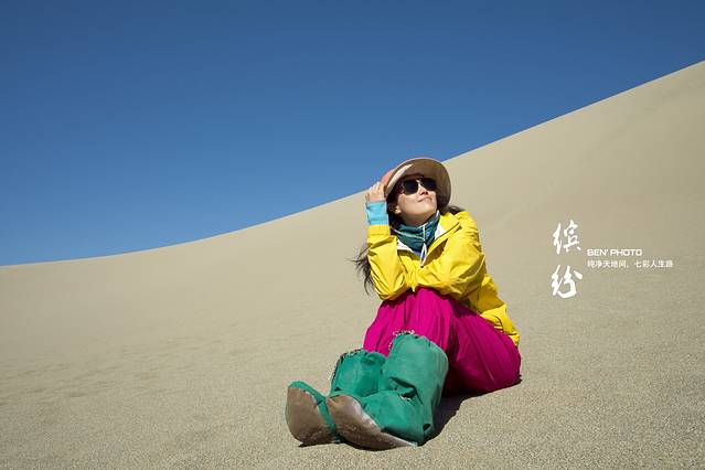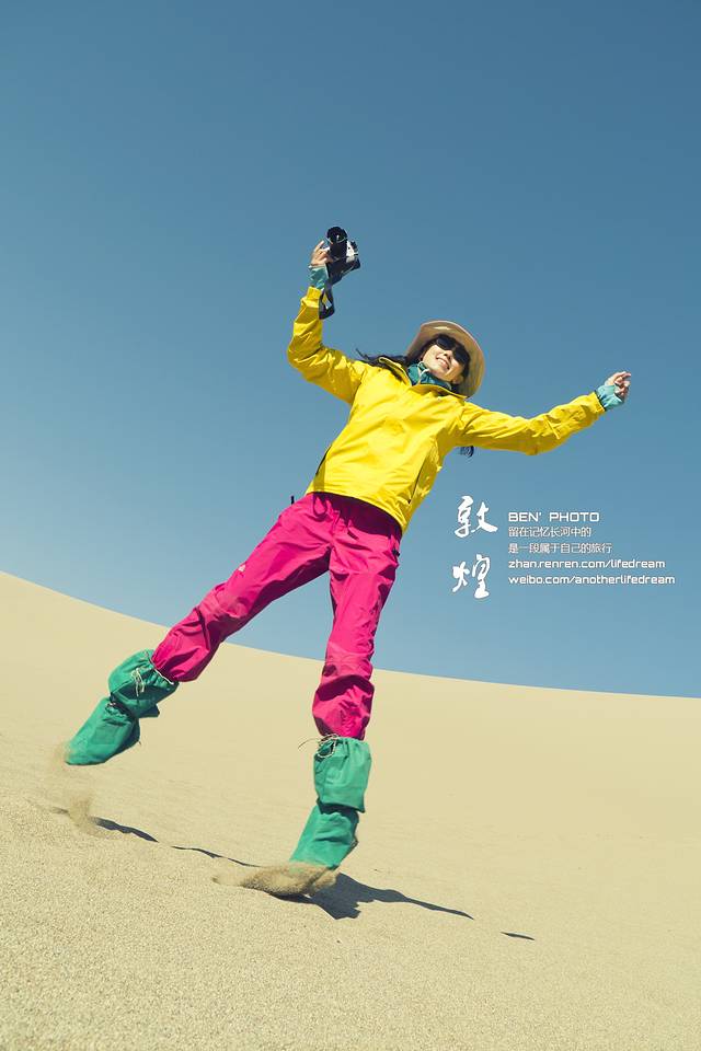 在月牙泉附近拍拍照,晶晶全身的色彩搭配都快成彩虹了,我还特意让她租了一个绿色防沙套,其他游客的都是橘红色。