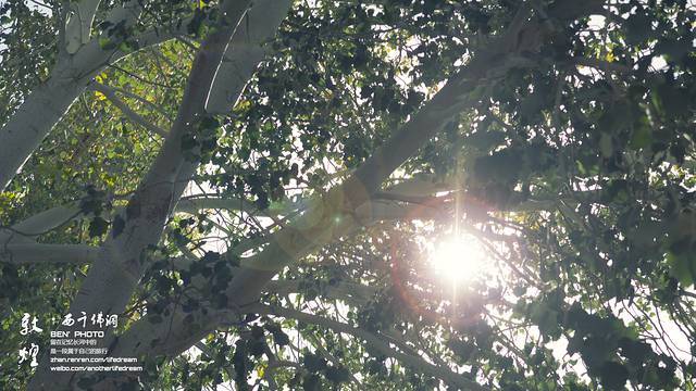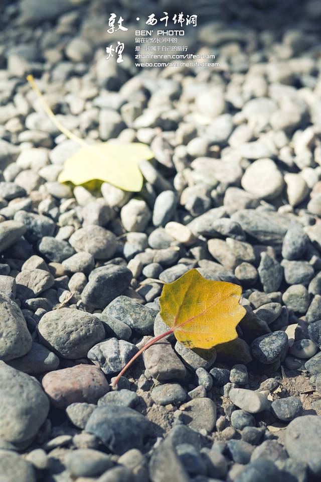 西千佛洞开凿在一条河流岸边,售票处位于早已干涸多年的河床上。地面由鹅卵石铺成,一侧是石窟的外壁,另一侧则是一片小树林。正午的阳光穿过树叶间的缝隙,洒落在斑斓的石块上,很有时代的沧桑之感。