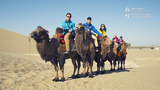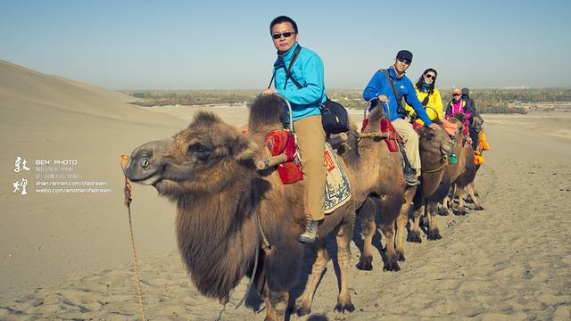 骆驼票100元每人,从门口走到滑沙处,再折返到月牙泉附近的乘车处。一共大概一个多小时,倒不是距离多长,主要是骆驼走的实在是慢啊。