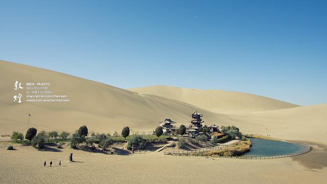 对于月牙泉的拍摄我总觉得不够理想,不甘心就此打道回府,于是一路狂奔攀上附近一座较高的沙山,可角度依旧是不好,白出了一身的臭汗。
