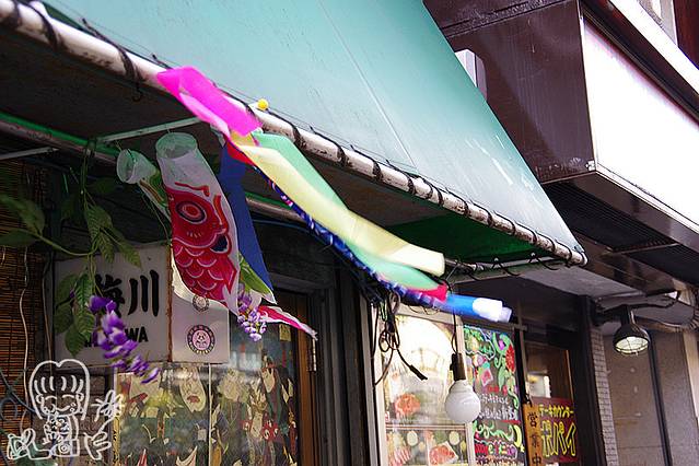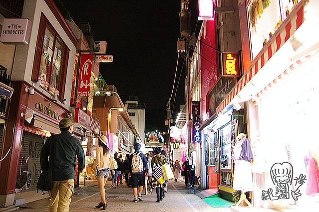 啊虽然有些远,仔细看右边蓝色小招牌下面那小子,踩个高大的木屐招揽客人,银白色到头发,不愧是原宿!