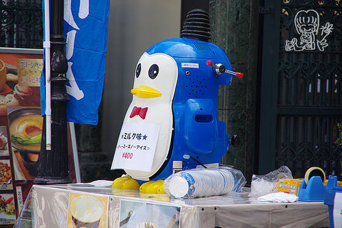 企鹅型刨冰机!好想拥有一个啊。后来虽然买到了一个白熊型的,但还是在寻找。日本的家用型刨冰机究竟有多便宜呢,只需一碗店里坐着吃的刨冰钱!