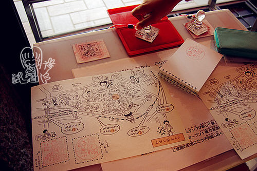 美术馆的纪念印章,附有手绘地图纪念用纸。日本刻章非常贵,普通人名章最便宜的是1600日元起,而JR的纪念章也是各站出去花钱做的,要三万一个。所以丢一个的话是很不得了的事情。象我在栃木的日光盖到的那个双色原子大章,造价绝对在6万以上。