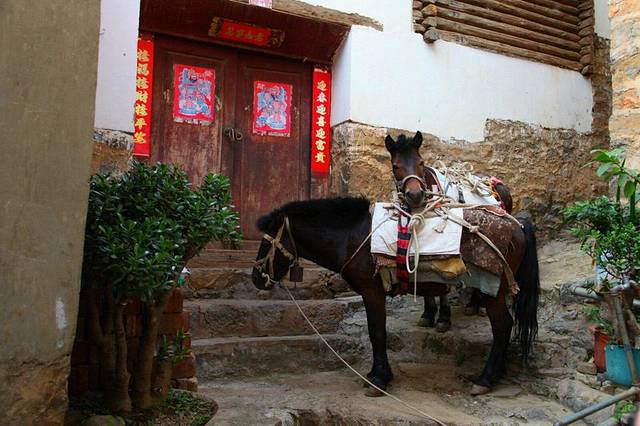 宝山石头因百余户人家聚居在一座独立的蘑菇状巨石之上而得名。城内瓦屋鳞鳞,巷道纵横、狭窄陡峭,运输全靠马驮或人背。石头城三面皆是悬崖绝壁,一面石坡直插金沙江,仅有南北两座石门可供出入(我们的汽车只能停在城门外),是一座真正的天险之城。