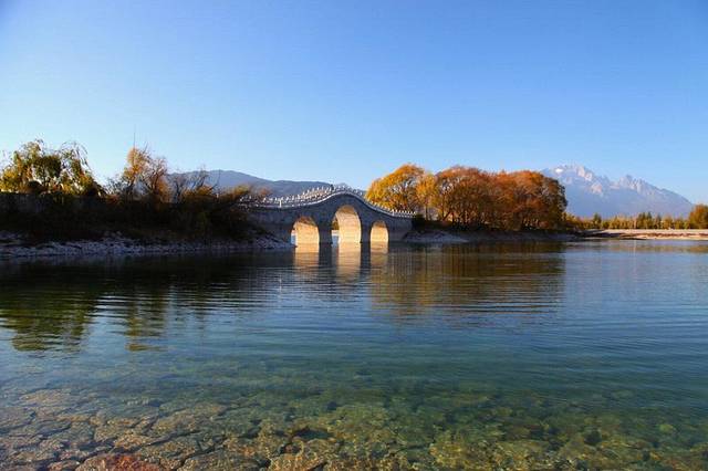 这座拱桥将水库分成两部分,风景因岸边的景物各有不同,但水却一如既往地清澈