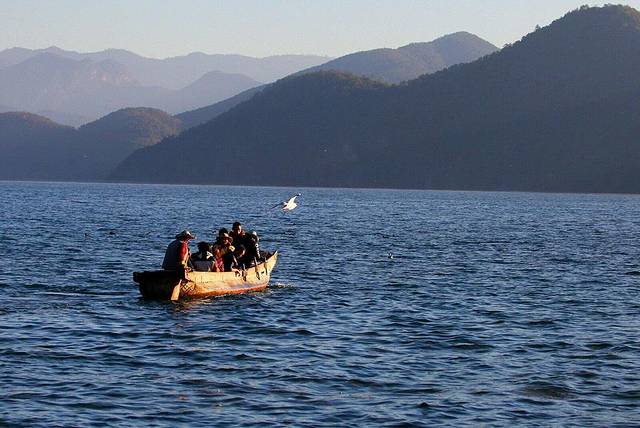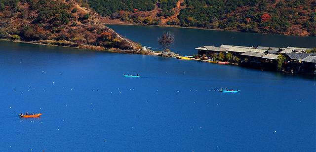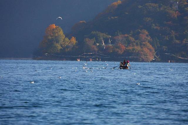 泸沽湖生态环境很好,人鸟和谐共处,只要你撒面包屑,一群群地鸟儿追随抢夺,很是热闹。