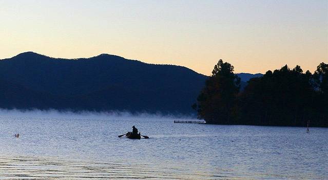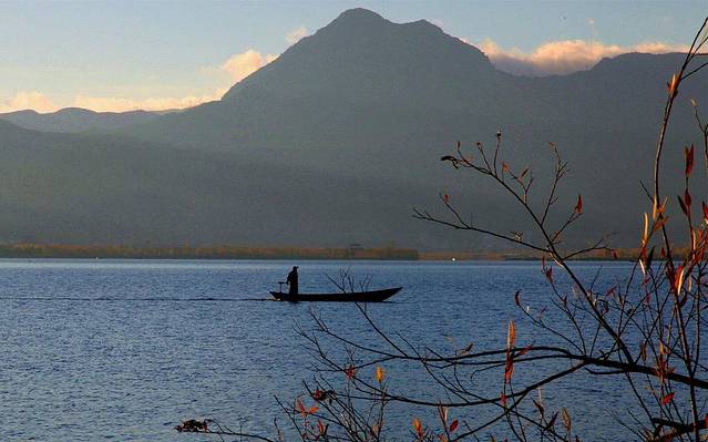 清晨温度很低,湖面远处泛起氤氲,勤劳的村民开始出湖捕鱼