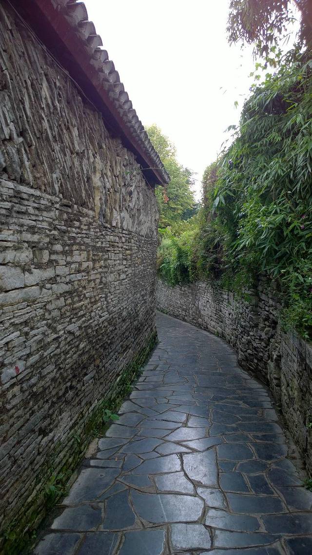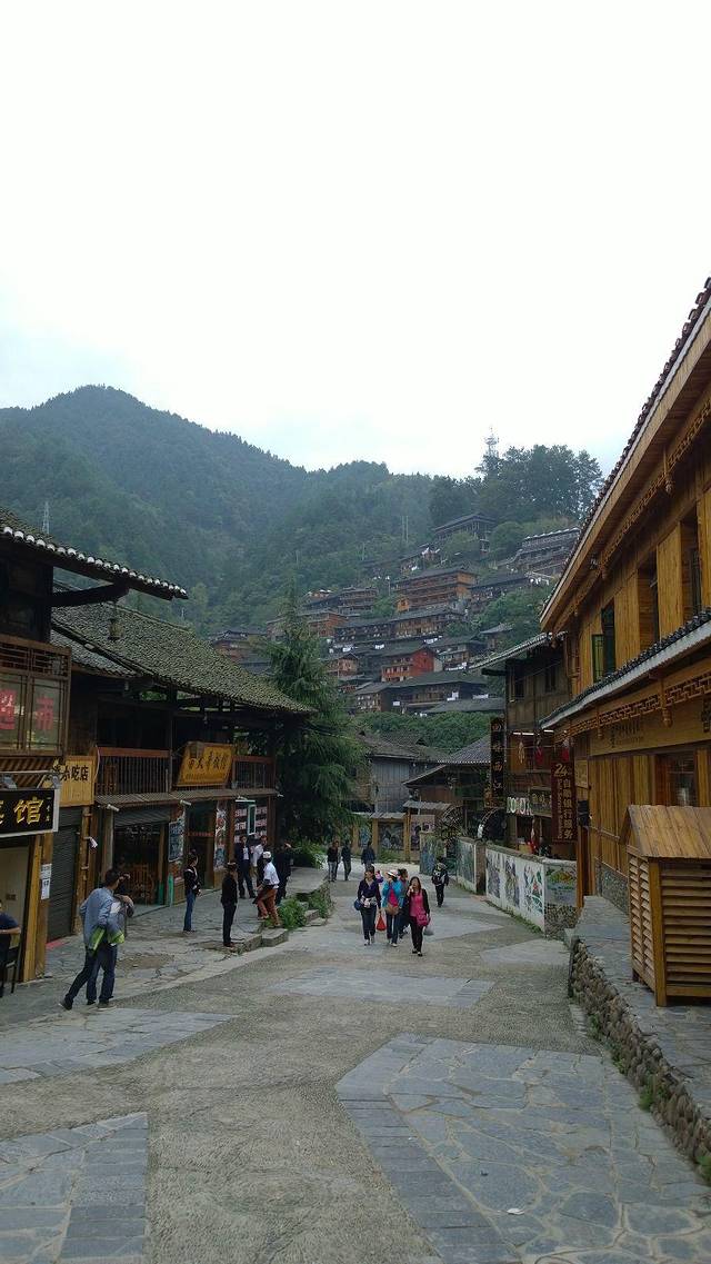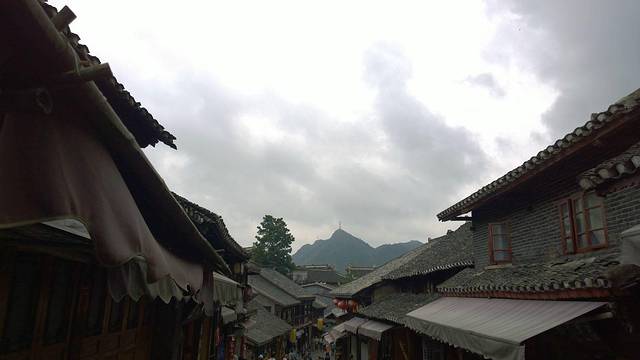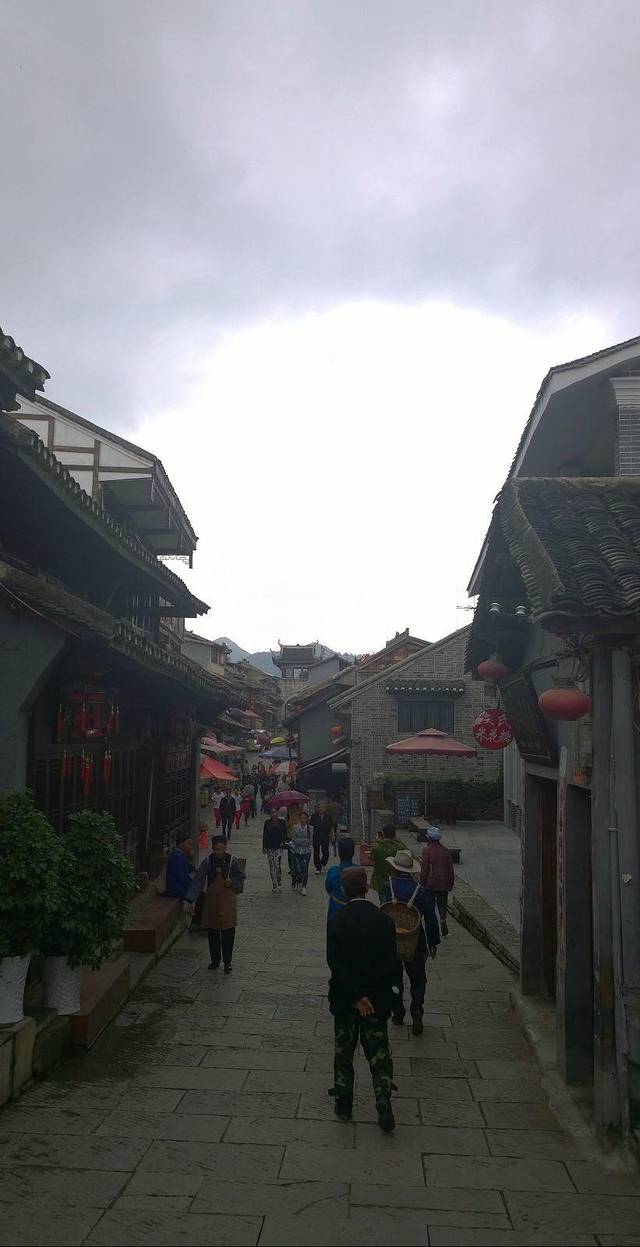 古镇坐落于山坡之上,呈高低错落之美,主街正对远处高峰,颇显构思精巧