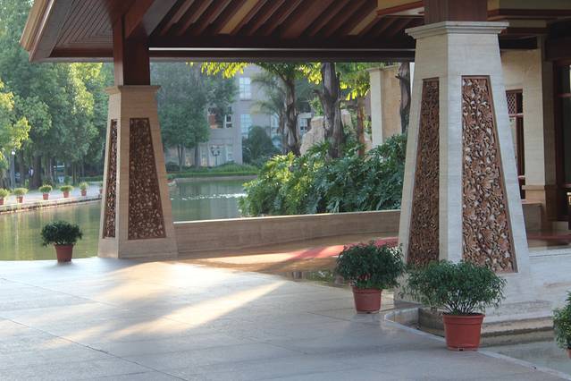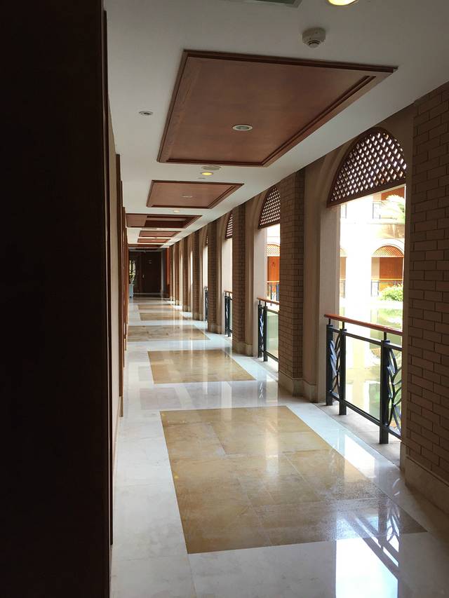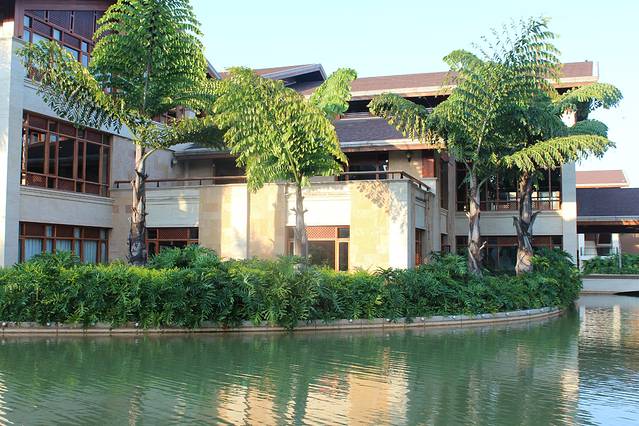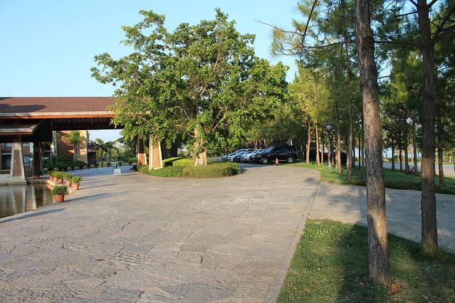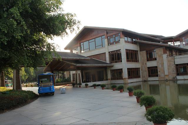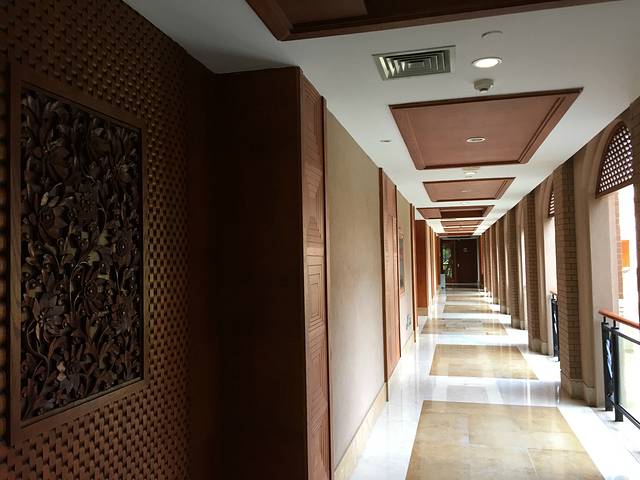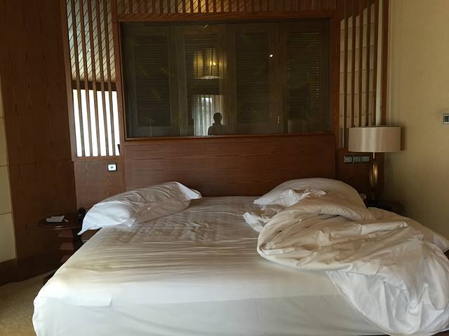 酒店在景区,所以周边总体环境优美,景色怡人。整个酒店低调内敛的奢华,淡淡的东西方海滩格调的融和,酒店整个装修大量使用红色实木和金色的地板和背景墙,实在是喜欢。酒店房间非常好,大的很实在,空间利用很好,房间宽敞干净,热水空调都给力。A栋的位置也很好,就在湖边,视野很好。个人觉得非常对得起这个价格。
