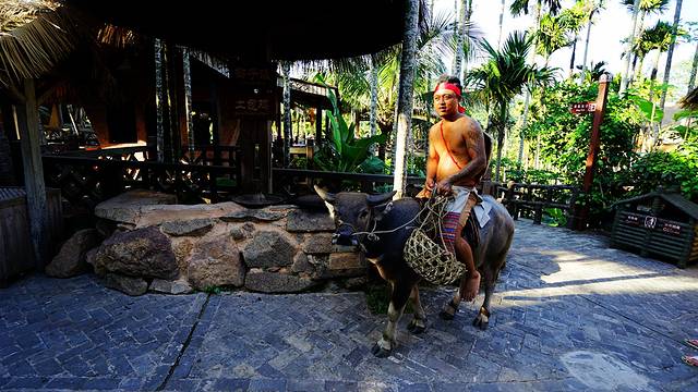 槟榔谷地处三亚市与保亭县交界处甘什岭自然保护区境内,因为景区两边森林峻峭,中间是一条连绵数公里的槟榔谷地,所以叫槟榔谷。槟榔谷是展现黎族和苗族文化风情的景区,由原住民黎村、百年苗家和原神秘雨林三大板块组成,包括非遗村、甘什黎村、谷银苗家、田野黎家、《槟榔·古韵》大型实景演出、兰花小木屋、黎苗风味美食街七大文化体验区。景区面积虽然很大,但我觉得完全没有必要坐景区车,溜达溜达,一天玩下来时间和体力都正好。