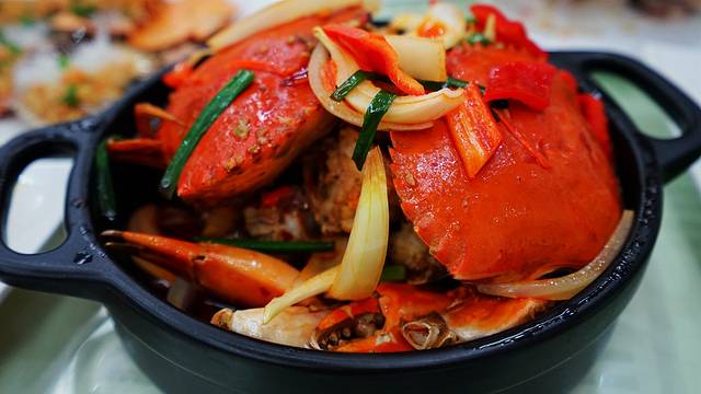 我们有备而来,点的都是网上推荐的他家的拿手菜,其实你到店里他们也会推荐这几样的。首先就是这个干锅香辣和乐蟹。和乐蟹是海南四大名菜之一,虽然普通做法是清蒸,但对于我们喜欢吃辣的内地游客来说,这香辣的做法更有味道。这可不是普通吃到的那种很小的香辣蟹,而是海南的和乐蟹。和乐蟹其实就是青蟹,也叫膏蟹,但海南的青蟹与别处不同,脂膏金黄油亮,犹如咸鸭蛋黄,吃起来香味扑鼻,而且非常饱满,蟹肉也特别多。