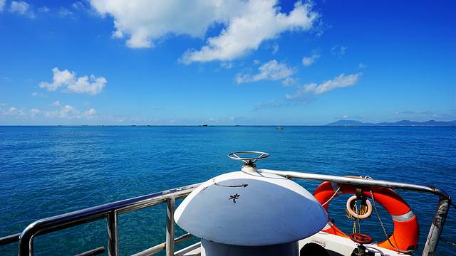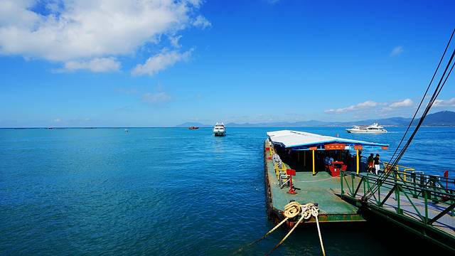 其实西岛离海岸很近,坐快艇的话十分钟都用不了,我们这个大游艇也就用了十几分钟,很快就抵达了西岛的码头。回头能看见三亚湾清晰的海岸线,从这里看海水更清澈蔚蓝,景色更美。