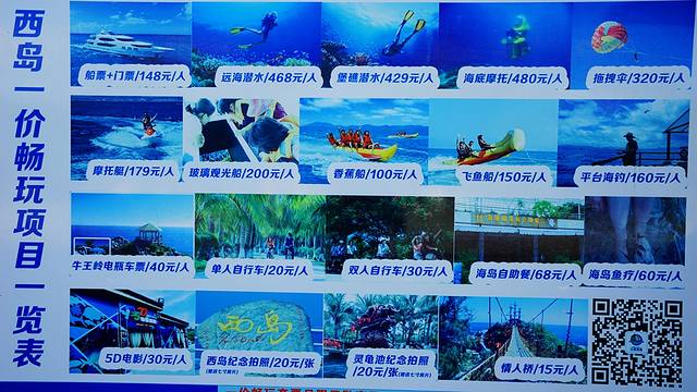 这个“一价畅玩”包括船票+门票、牛王岭电瓶车、堡礁潜水、远海潜水、海底摩托、香蕉船、飞鱼船、玻璃观光船、摩托艇、拖曳伞、海岛自助餐、平台海钓、海岛鱼疗、5D电影、西岛纪念拍照、灵龟池纪念拍照、情人桥、单人自行车(双人)、海岛鱼疗等。其中两个潜水加上海底摩托的价格就差不多值回票价了,再加上香蕉船、飞鱼船、摩托艇、拖曳伞也特别刺激,还包含门票、船票、电瓶车和自助餐,所以非常合算。