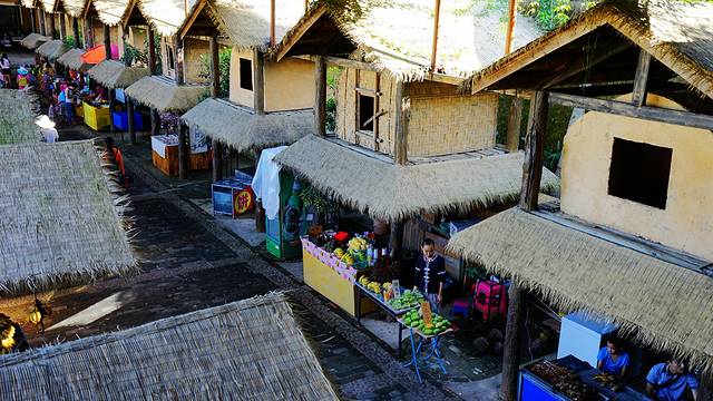 景区依山而建,进门以后不坐景区车就上阁楼一直就往上走,下面就是很有热带原始风情和民族特色的集市。