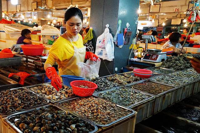 明珠广场出来,天色已经完全暗了下来。后门的对面就是春园海鲜市场,先过去转转。这里很像是大排档,不同的加工店都分布在两边,没有店名,只有几排几号,所以感觉没有什么特色,而且这里购买海鲜的价格也比第一市场要贵些,所以人气并不旺。