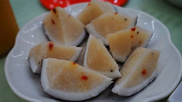 这个椰子饭要特别介绍一下,因为特别有特色,已经成了三亚吃海鲜时的标配主食。椰子饭就是把糯米装进切开后的椰子里,和椰汁、椰肉一起蒸熟,然后切开来,就成了海南最著名的小吃。