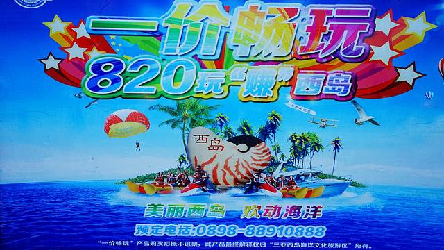 给大家推荐一下西岛的这个820元“一价畅玩”的项目,网上订只要780元,我觉得比蜈支洲岛1399元“一价畅玩”的项目合算些,蜈支洲岛虽然多了个“海天飞龙”和“动感飞艇”,不过这两样都太刺激,一般人玩不了,而且价格多了将近一倍。