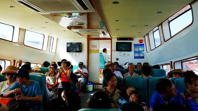 在肖旗港码头坐船去西岛,要是人少的话会坐敞篷的小快艇,那就很有意思了。可惜我们去的时候人多,排长队坐的大游艇,不能出船舱,没啥意思。