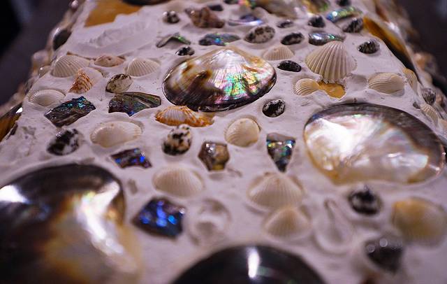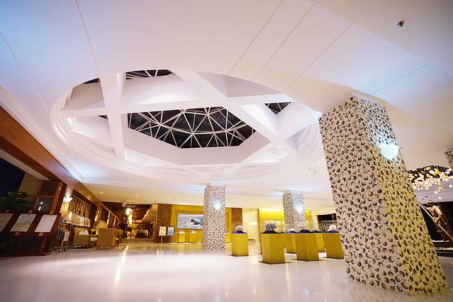 酒店大堂,贝壳装饰的柱子,吊灯上也是贝壳风铃