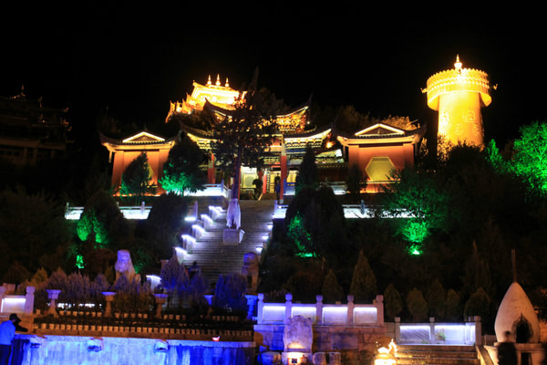早8:00MF8405厦门 -昆明 ,1100到昆明 。由于昆明 长水机场离市区较远,选择在昆明 机场等待后续航班。昆明 新机场餐饮价格较贵,过桥米线,65元。下午1750MU5931昆明 -香格里拉 ,1850到达迪庆香格里拉 机场。打车至独克宗古城,耗时15分钟,车费30元(行情价)。入住自由生活驿站(0887-8297755),大床房140元/间。该客栈也是其它驴友推荐的,此行共住三晚,感觉非常超值。安顿好后去利明小吃店,离古城很近,菜品不错,价格便宜。饭后在古城散步,很多人在四方街跳舞,很是热闹。绕过四方街,不久可到龟山公园。龟山公园中最醒目的标志是一个巨大转经筒,需要众人齐心协力,方可转动。我也参与其中,转动巨大的转经筒,为家人及此次旅行祈福。