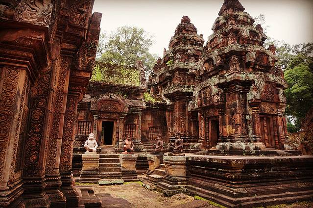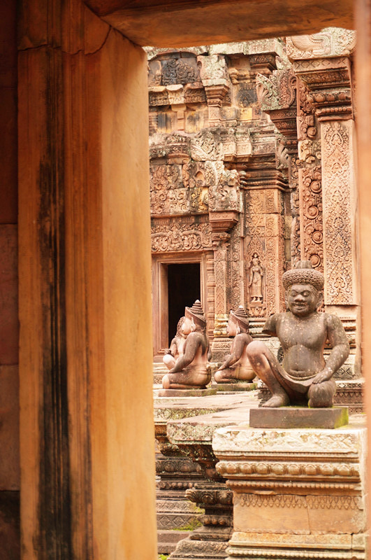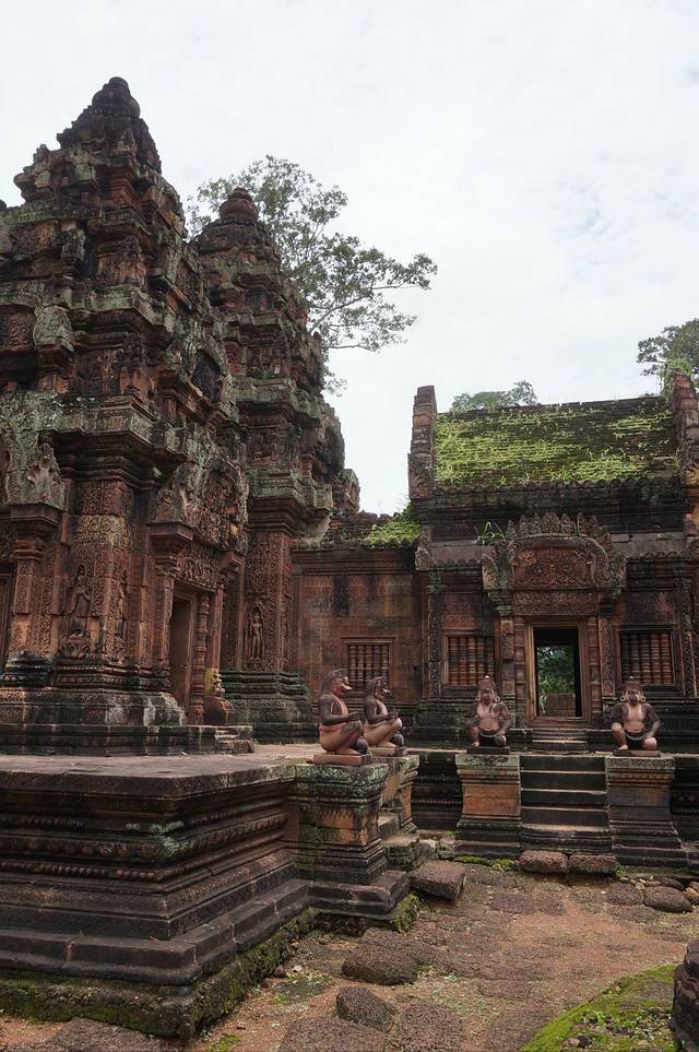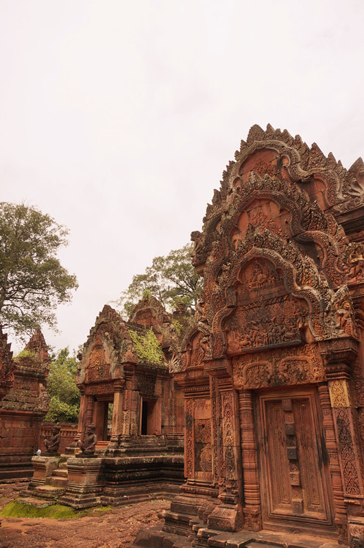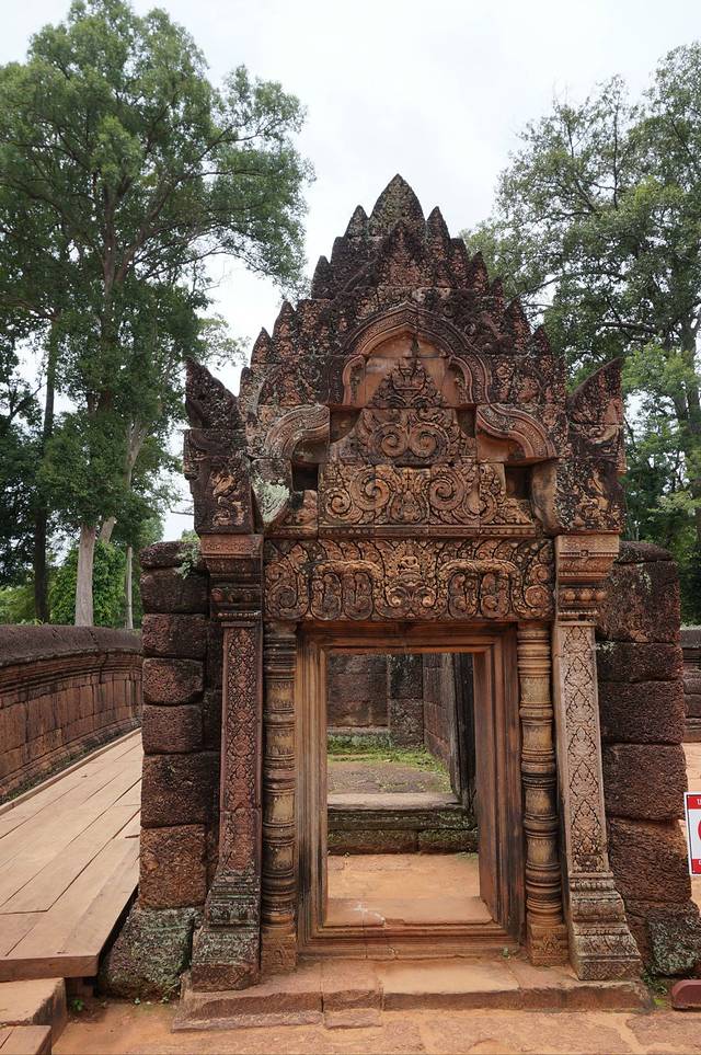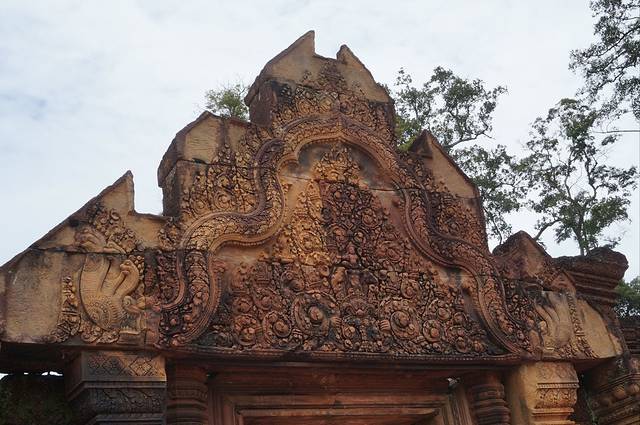 用红色砂岩建造,颜色很艳丽,是供奉湿婆的寺庙,它的浮雕非常精致细腻,浮雕上有很多女神,这里也被称为“吴哥古迹中的明珠”、“吴哥艺术之钻”。
