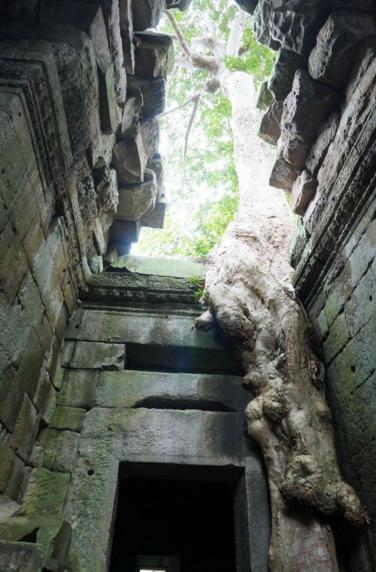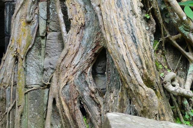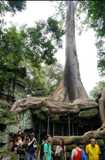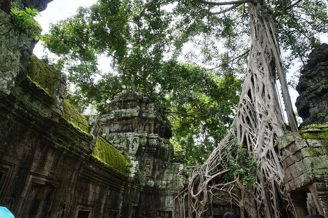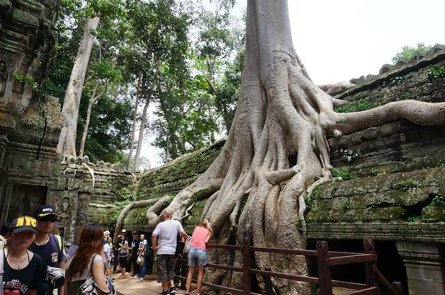 关键词:共生与纠缠。高棉国王阇耶跋摩七世为母亲而修造。巨大的树木侵入石块,在撕裂建筑的同时也支撑着它,所以是“共生”。巨树在空隙间生长,紧紧地缠绕着古庙,让人不得不觉得神奇。这里也是古墓丽影的取景地。